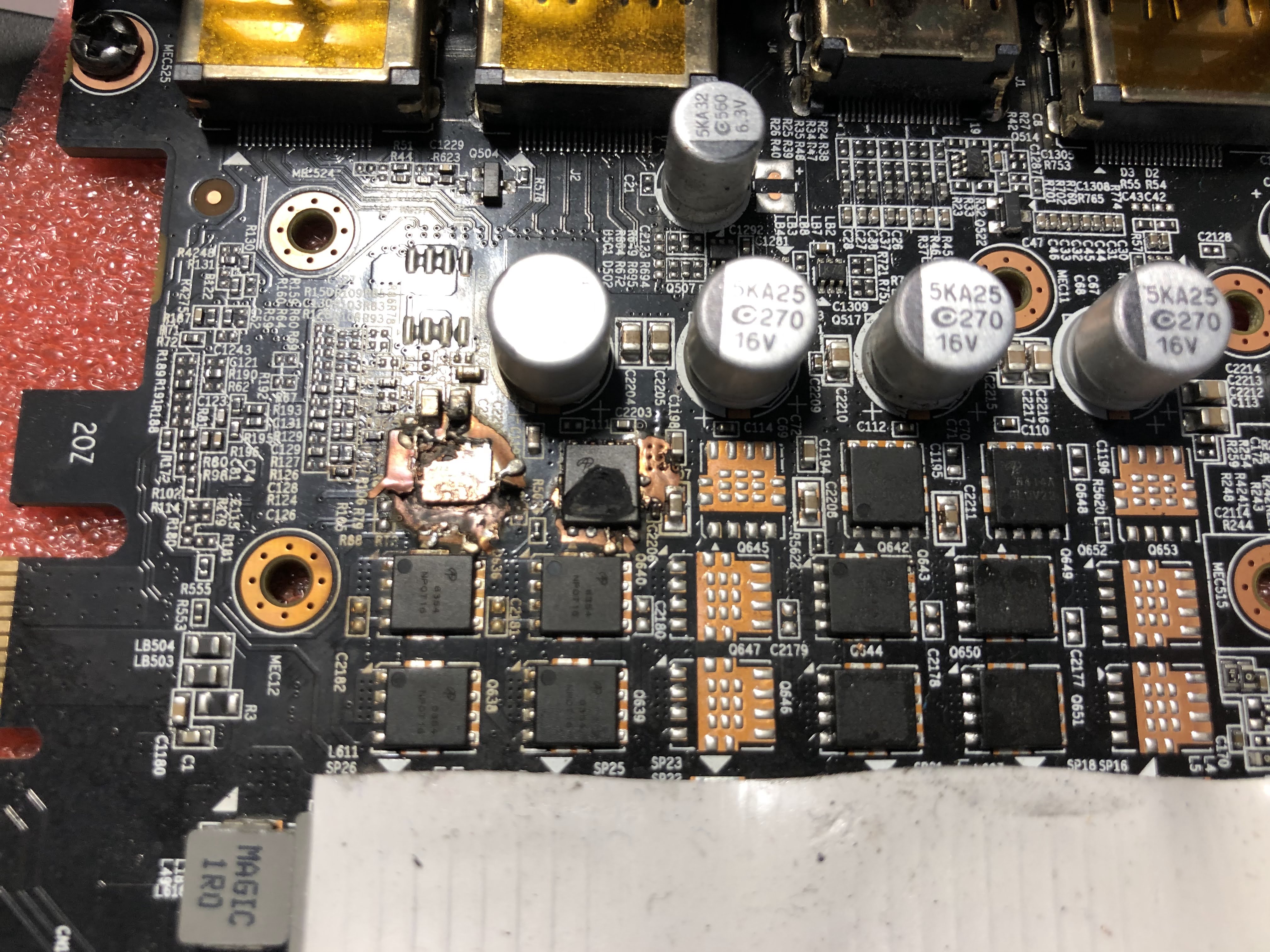 Co šlo jsem vzal kartáčkem a isopropylem, ale to vypadá, že už asi nezůstaly žádný dráhy od toho MOSFETu na desce? Nejsem elektrotechnik, jen asi pokročilejší uživatel, rád se na tom aspoň poučím, co je špatně :)