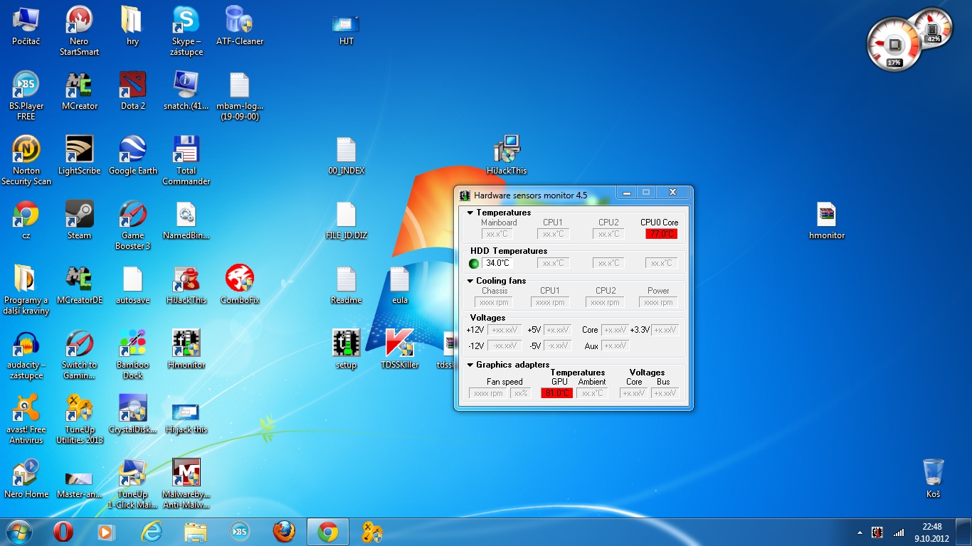Mám tam jeden hardisk, ale mám tam místní disk C a D na céčku mám 96 a nějaké drobné a na tom mám volné 4,5GB a na místní disk D u něho nemám nic napsané jak jsem psal v první příspěvku, ale tam jsem měl volné asi 50 GB --- Doplnění předchozího příspěvku (16 Pro 2012 19:36) --- A jinak co by se stal...