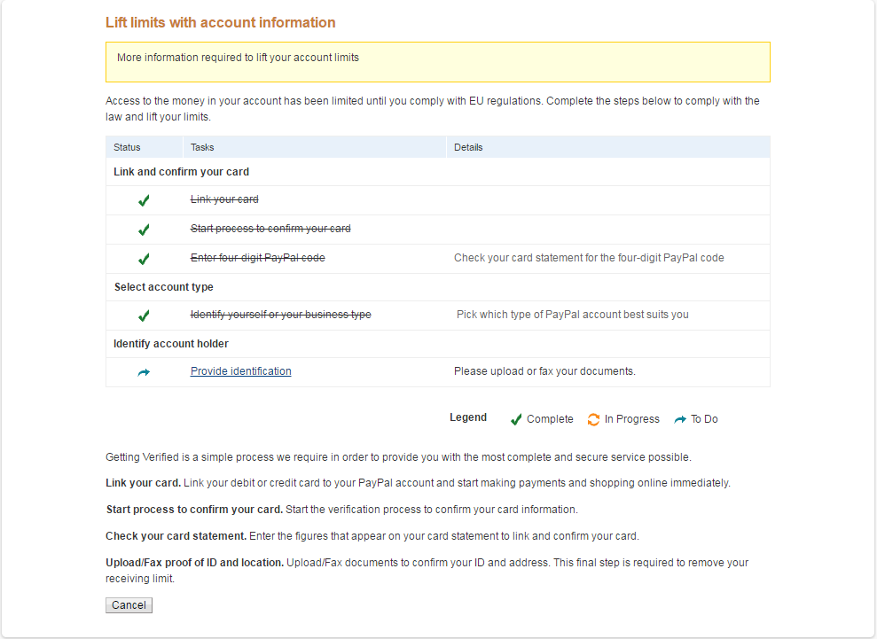 Zdravím potřeboval bych si zrušit limity na paypalu. Jel jsem podle návodu, odečetli mi 50,- z účtu, kde mi přišel kód na ověření, po aktivování karty na paypal mi částku 50,- vrátili. Dále po mě chtěli totožnost tak jsem oskenoval a poslal občanský průkaz.. Už je tomu asi 6 dní ale limity mám stále...