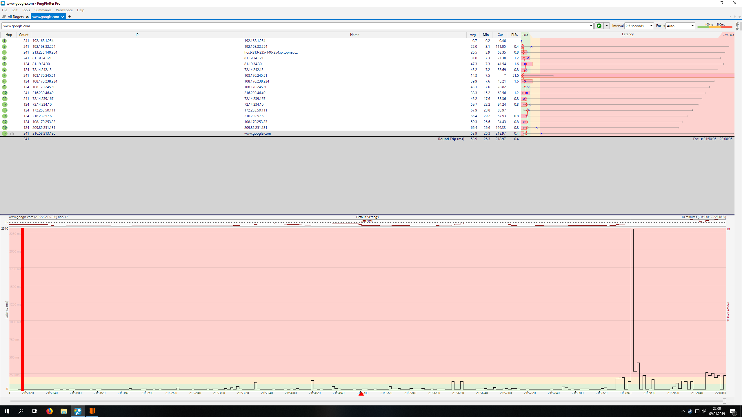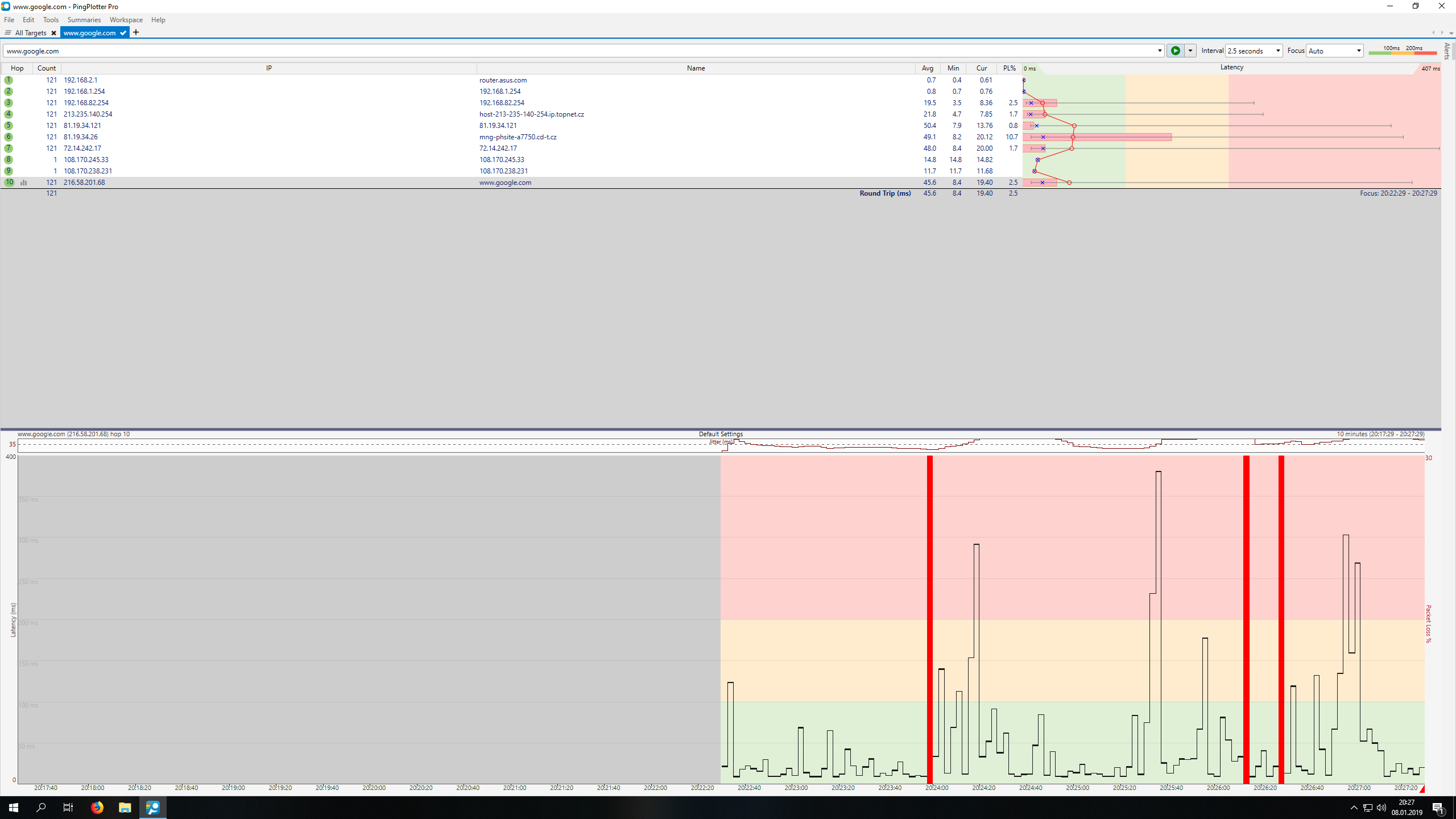 Nevěděl jsem jak to mám přesně měřit přes ten pingpltter, tak jsem vše vypl a dal tam adresu google.com a měřil to přes ten program, během měření jsem na netu/pc nic nedělal