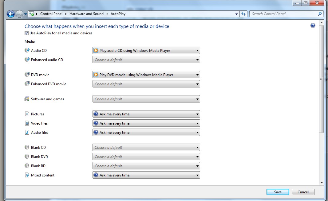 kontrol panel...hardware and sound....autoplay.....tam si stim pohraj