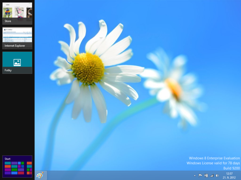O zbrusu novém levém postranním panelu již byla řeč. Slouží k přepínání mezi běžícími programy pro Metro. Kromě zobrazení při stisknutí Win+Tab se zobrazí i při najetí myši k levému okraji obrazovky. Při najetí myši k jejímu levému dolnímu rohu a následném kliknutí lze z klasického rozhraní přejít na obrazovku Start v rozhraní Metro (ke stejnému účelu slouží tlačítko Win na klávesnici). V Metru pak zase jedna z dlaždic je určena pro přechod do klasického desktopového rozhraní.