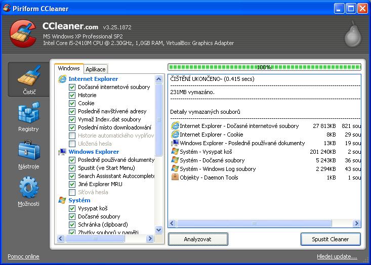 Proběhne čištění složek systému Windows a programů uvedených v položce Aplikace, na jehož konci nám Ccleaner oznámí, co všechno bylo vyčištěno a jak velký prostor se při čištění uvolnil.