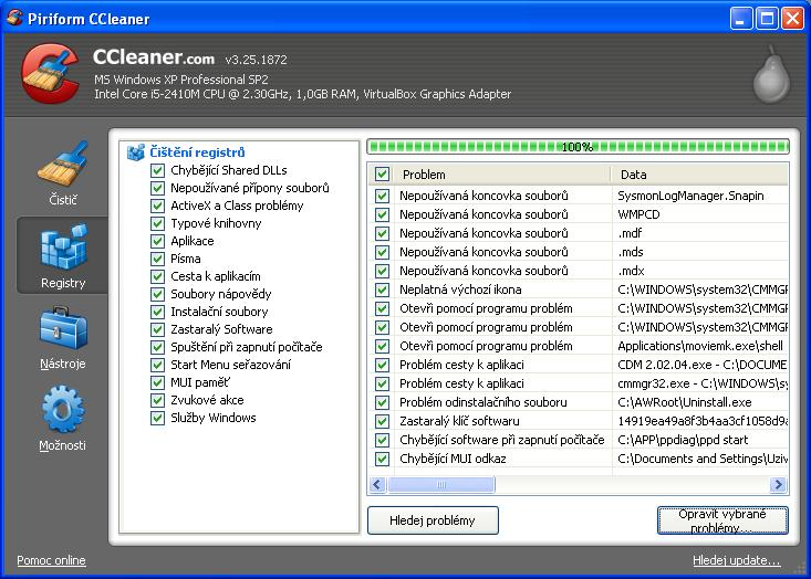 Po ukončení čištění programů a systému se přesuneme na levou stranu a zvolíme možnost Registry Tato volba zkontroluje nesrovnalosti v registrech systému a navrhne jejich odstranění. Opět ponecháme defaultní nastavení parametrů čištění a spustíme kontrolu tlačítkem Hledej problémy. Po ukončení skenu dáme Opravit vybrané problémy...