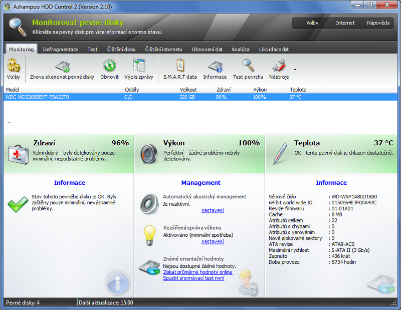 Výhodou je možnost kontroly jejich kondice, takže dosluhující pevný disk je možné odhalit ještě před jeho selháním. Informace o kondici prozradí i bezplatná verze programu HD Tune, nicméně v uživatelsky přívětivější podobě tyto informace servíruje program Ashampoo HDD Control. Za 24,99 USD přináší také nástroje pro výkonnou defragmentaci, obnovu omylem smazaných dat, bezpečné smazání citlivých dat nebo čistění obsahu disku od přebytečných souborů.