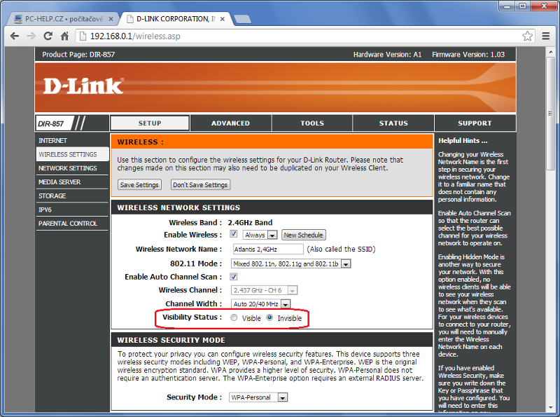 Kdo si potrpí na vysokou úroveň zabezpečení má samozřejmě další možnosti, jak svou síť ochránit resp. jak ještě zvýšit úroveň ochrany. Například Wi-Fi síť lze skrýt. Tedy přesněji řečeno nastavit tak, aby nevysílala SSID. Pak není viditelná mezi dostupnými sítěmi ani na těch zařízeních, které jsou v jejím dosahu. Pro připojení k takové síti je nutné vedle hesla (klíče) znát i jméno sítě (SSID) a zadat jej manuálně.