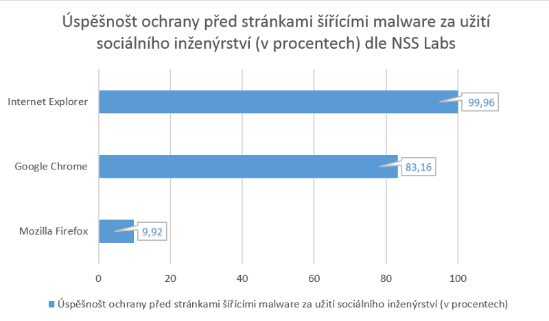 Co to znamená v praxi? Že Internet Explorer z testu vychází mnohem lépe než Google Chrome či Mozilla Firefox. Tyto prohlížeče během testování poskytly ochranu na základě reputace webové stránky jen zhruba v 10 % případů. Internet Explorer však v 83 % případů, takže z testu vychází coby jednoznačný vítěz jak z hlediska poskytnuté ochrany, tak z hlediska použité technologie.