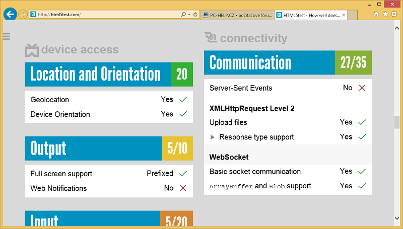 Test realizovaný při přípravě tohoto článku pod Windows 8.1 dopadl nejlépe pro Google Chrome 35, který získal skóre 4549 bodů. Druhé místo obsadil Mozilla Firefox 29, který si vybojoval 3992 bodů. Poněkud překvapivě až na třetí příčce skončil Internet Explorer 11, který dosáhl jen na 3307 bodů, přestože subjektivně se na daném PC jeví jako nejrychlejší prohlížeč.