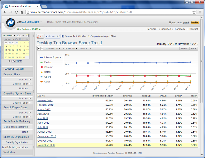 V listopadu 2012 byly karty rozdány takto: první Internet Explorer si z tržního koláče ukousl 54,76 procenta, druhý Mozilla Firefox 20,44 procenta, třetí Google Chrome již zmíněných 17,24 procenta, čtvrté Safari 5,33 procenta a pátá Opera 1,67 procenta. Při meziročním srovnání si Google Chrome pohoršil o 0,94 procentního bodu.
