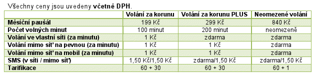 Tarif Volání za korunu s měsíčním paušálem 199 Kč nabízí hovorné 1 Kč za minutu do všech sítí v České republice při tarifikaci 60+30. Cena odchozí SMS zprávy je 1,50 Kč. Součástí tarifu je sto volných minut na volání do všech sítí. Tarif má ještě variantu Plus, která s paušálem 299 Kč nabízí dvojnásobek volných minut na volání a bezplatné volání a posílání zpráv v rámci vlastní sítě.