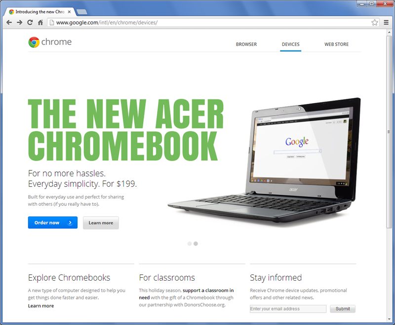 Google tedy de facto dává firmám nůž na krk: přejděte na placenou verzi Google Apps, která vás bez daně vyjde nejméně na 40 dolarů za jednoho zaměstnance ročně, nebo si pořiďte zařízení s naší platformou. A zde se dostávají ke slovu Chromebooky, přenosné počítače vybavené systémem Google Chrome OS.