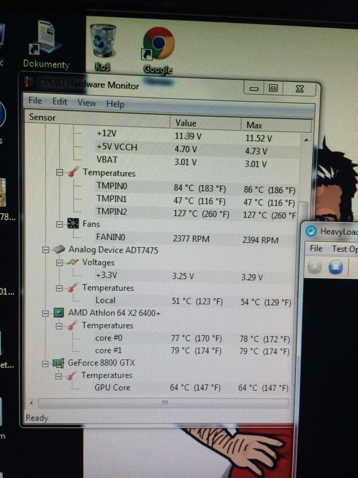 Zapnul jsem heavy load a po chvíli se to seklo, tak jsem to zapnul znova a zase po chvíli sek tak jsem aspoň vyfotil telefonem seknutou obrazovku kde je HW monitor a teploty jsou docela vysoký no, Asi tomu hodně napomohlo to, že mam momentálně v pokoji 30 stupňů jinak jsem teploty měl v pohodě.