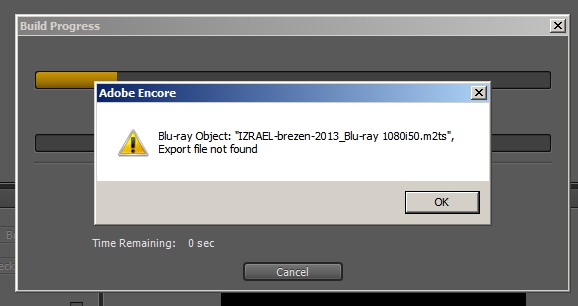 Abych neplýtval médii, chtěl jsem nejprve vytvořit obraz disku či složku s daty, ale Adobe Encore odmítá spolupracovat s tím, že cílový soubor (teď program uvede název zdrojového souboru) neexistuje (zdrojový soubor ve skutečnosti existuje, název neobsahuje diakritiku a na cílovém disku je dostatek volného místa).