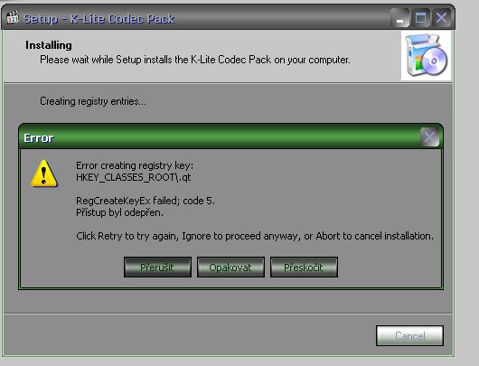 Nevím jestli je to důležité,ale když instaluji zpět K-lit Pack tak se mi ke konci instalace třikrát objeví viz.foto.Vždy dám přeskočit,a normálně se doinstaluje.Jenže dříve mi to nikdy nedělalo.Možná to nemá nic společného s potížemi alepokud někdo ví...