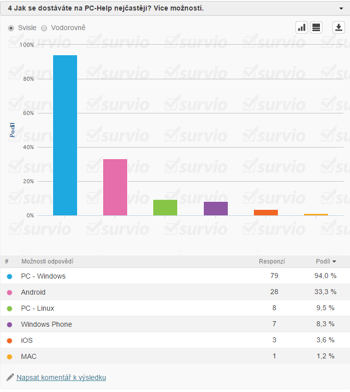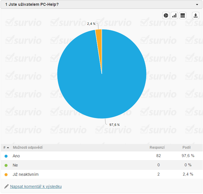 Platných odpovědí na dotazník bylo ve finále 84, z nichž 82 odpovědělo na první dotaz "Ano", tedy potvrdili, že jsou aktivními uživateli na PC-HELP.