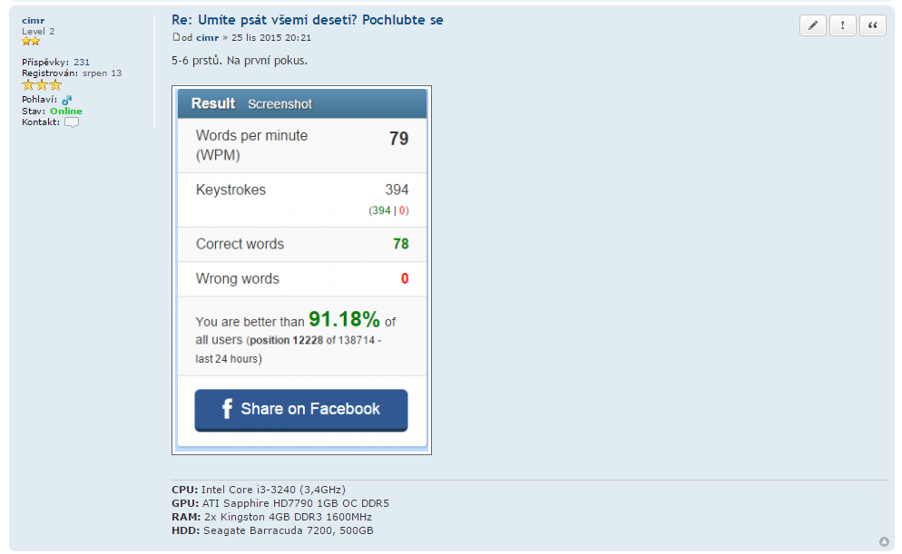 Ahoj, mám jeden dotaz. Je někde možné si udělat něco jako certifikát na psaní na klávesnici? Myslím, že píšu "celkem" rychle, tak bych si chtěl udělat někde nějaký certifikát nebo něco takového. Nevíte někdo o něčem? Děkuji.