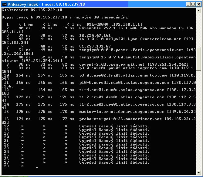 po zkouskach ping_u na serve neni odezva a hlasi mi to 100% ztartu... pri trasovani zkoncim u poskytovatele mista v praze kde maji majjitele hraciho servru pronajate misto. do prahy ping funguje viz obr.