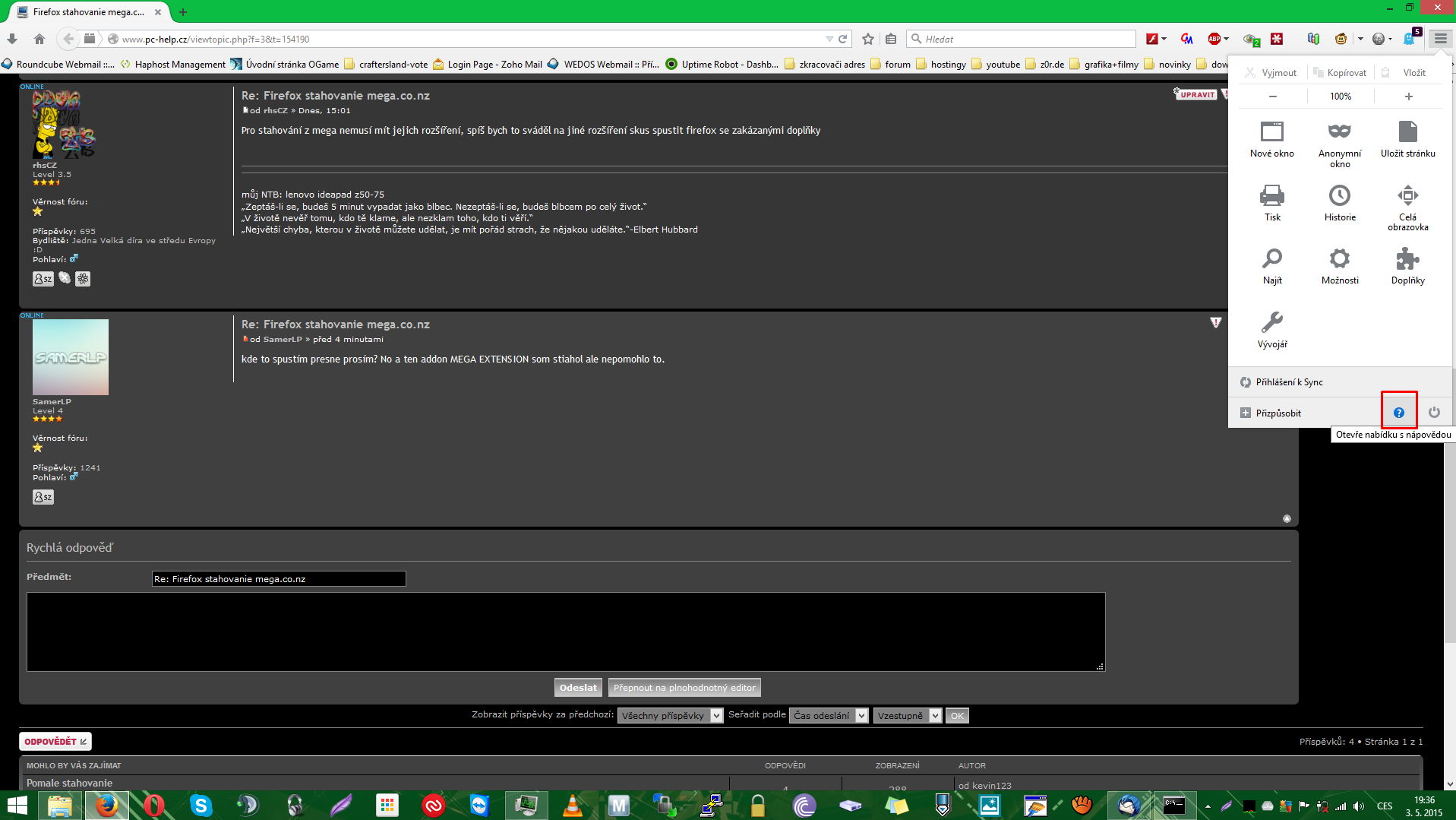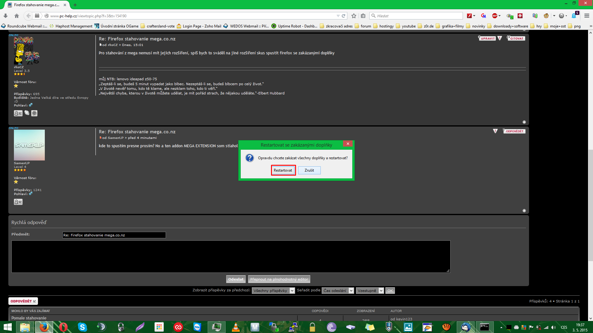 Zdravím, mám menší problém a to presnejšie, že s prehliadača Mozilla Firefox ktorý používam sa mi nedá vôbec stahovať žiadny súbor so stránky mega.co.nz a ale na prehladači Maxthon to v pohode stiahnem. Tento problém som vôbec nikdy nemal vždy mi to šlo kde by mohol byť teda prosím problém?