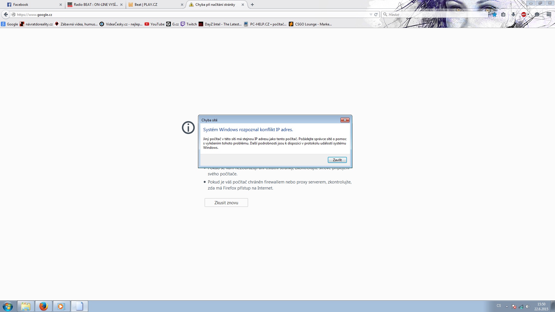 Nyní k dotazu - t.zn., že další připojený PC k tvoji síti má stejnou IP adresu. Co je na tom nejasného? Zkontroluj co máš ještě připojeno k síti.