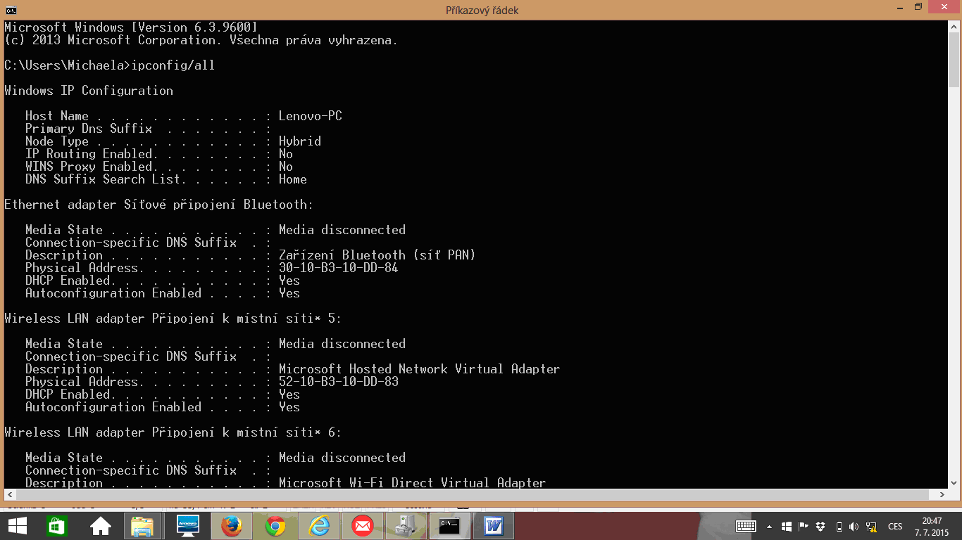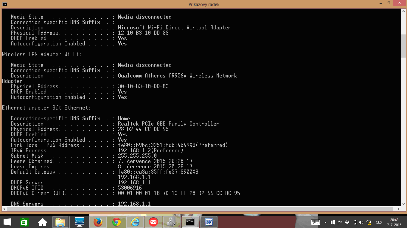 Pak mi vyscreenujte výsledek - potřebuju vedět, co se vypíše u Adaptér sítě Ethernet - Připojení k místní síti (možná bude třeba v tom příkazovým řádku rolovat).