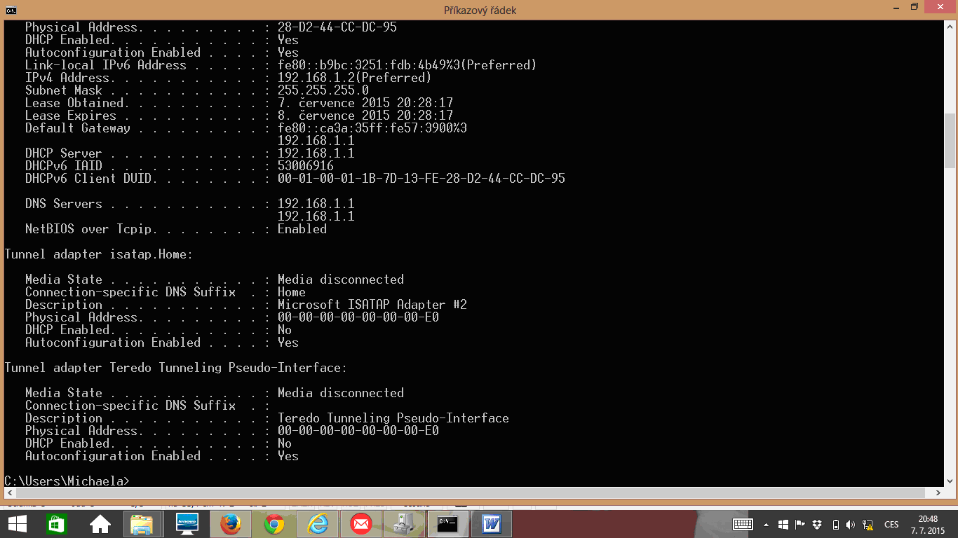 Každopádně po připojení ntb kabelem k tomu routeru (a asi po minutě čekání) spusťte Příkazový řádek Windows, zadejte ipconfig /all a Enter.