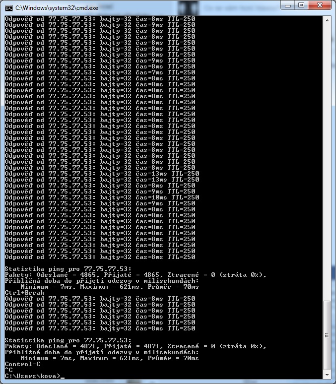 Příklad déle trvajícího přeskakování malých a velkých pingů. ( ping seznam.cz -t),