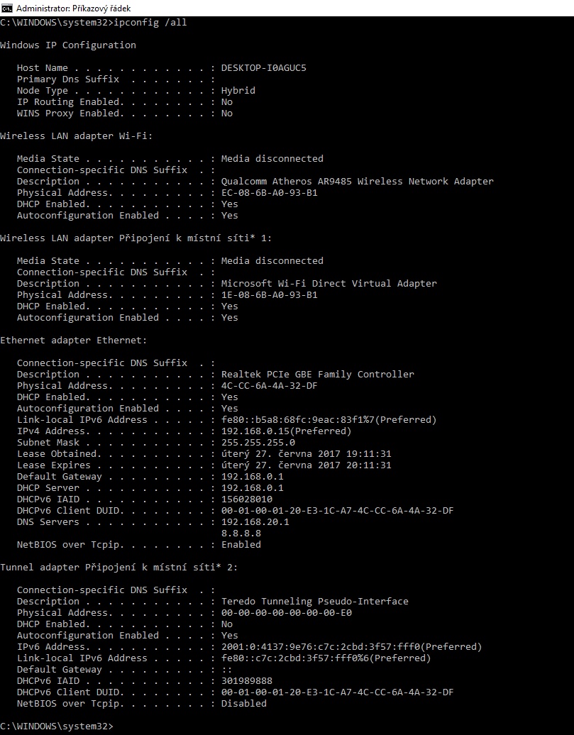 ipconfig /all ve funkčním stavu a ve výpadku.