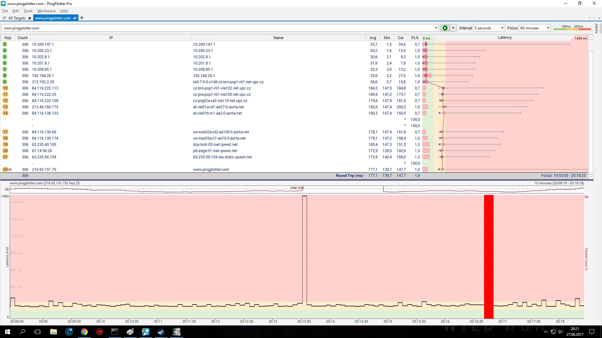Tak z pingplotter je vidět skok mezi IP 213.192.2.29 a 84.116.222.113 => tohle je na providera. Pošli nu ten screen.