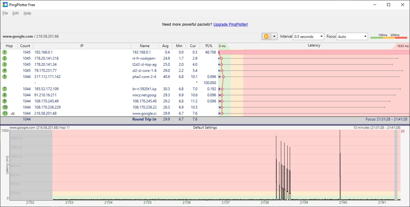 Četl jsem si zde i návod na na diagnostiku sítě a přidávám screen z Pingplotteru (už mi skončil bohužel trial, snad to nevadí)