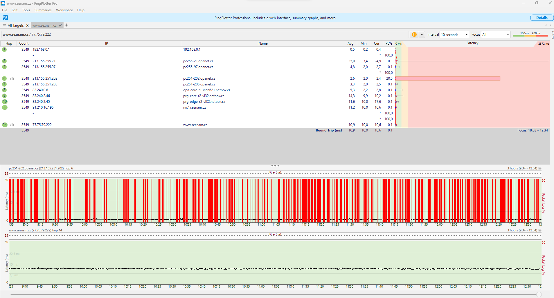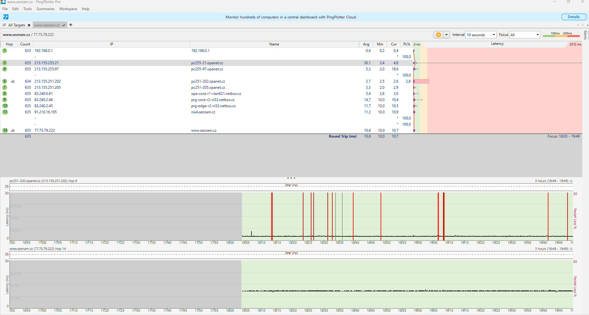 Ještě tedy přikládám screen z pingplotteru na kterém lze vidět packet loss na 6hopu ale nejde mně do hlavy proč když se podívám na čas v grafu kdy byl packet loss tak mi nesedí s časem kdy mi to reálně seklo ve hře nebo třeba při komunikaci na discordu..
