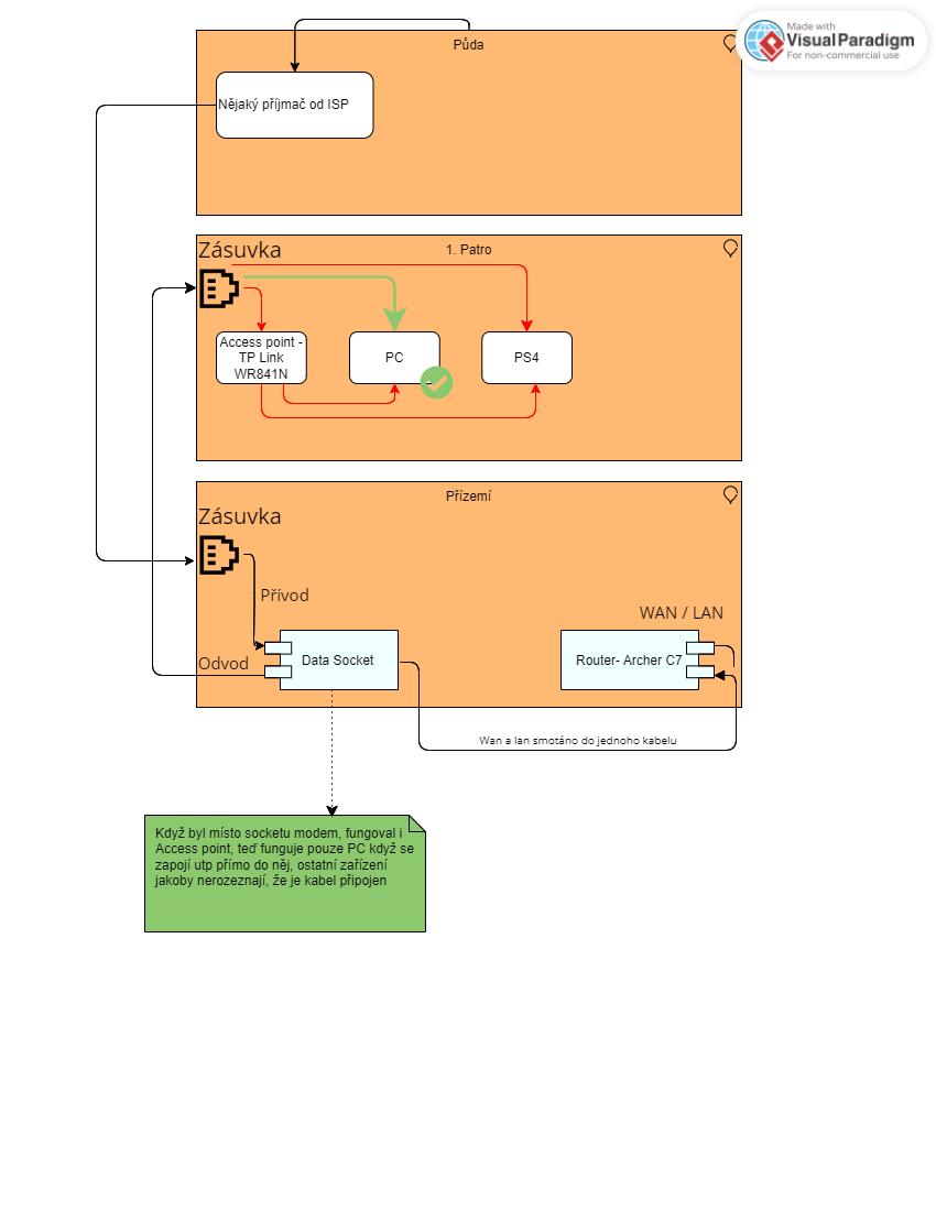 Původně byl místo data socketu modem, to vše fungovalo, nedávno tu ovšem byli experti měřit sílu připojení a přitom si řekli, že by bylo dobré modem zrušit a dát místo toho data socket a smotat mě kábly do jakésiho rozdvojujícího se soketu. Jak odjížděli tak jim Access point záhadně fungoval, takže nebyl problém wifi byla extendována a lan připojení taky fungovalo. Nicméně po chvíli to celé v 1. patře přestalo jet a jediné zařízení, které rozezná ten kabel a opravdu internet funguje je PC. Zkoušel jsem měnit kabely, různě připojovat starý modem, pohrát si s tím routrem, z kterého byl udělán access point, také třeba zkusit nastavit na PS4 ručně IP adresu a všechny náležitosti jako subnet mask default gateway DNS servery atd.. ale nic. Z nějakého důvodu to funguje jen když se zapojí do PC.