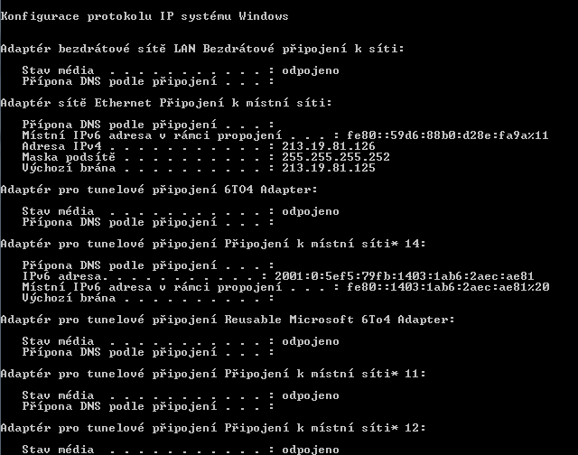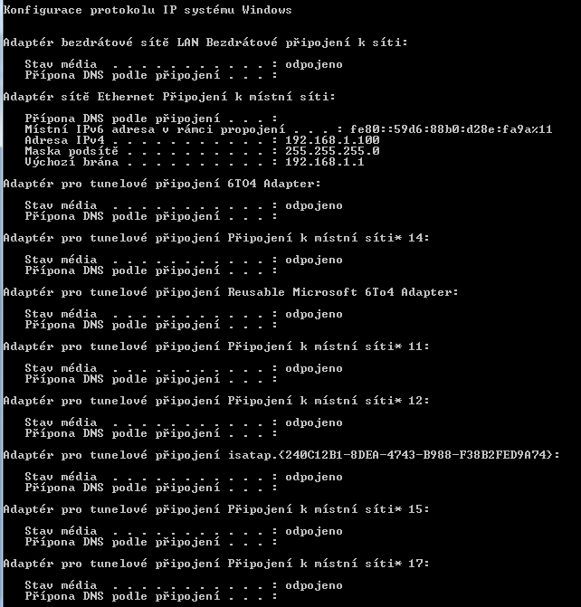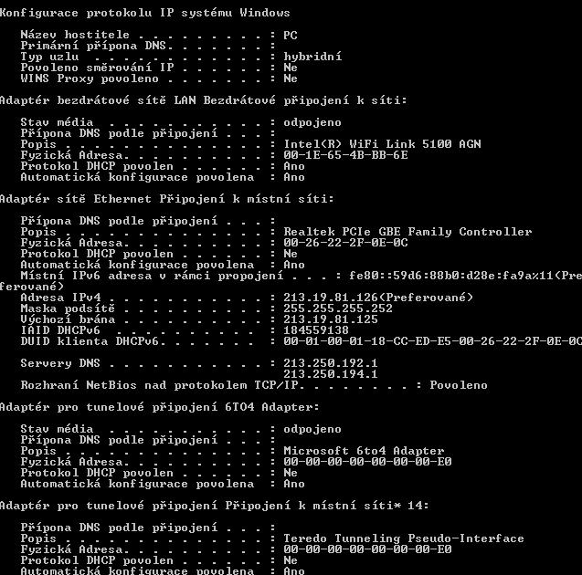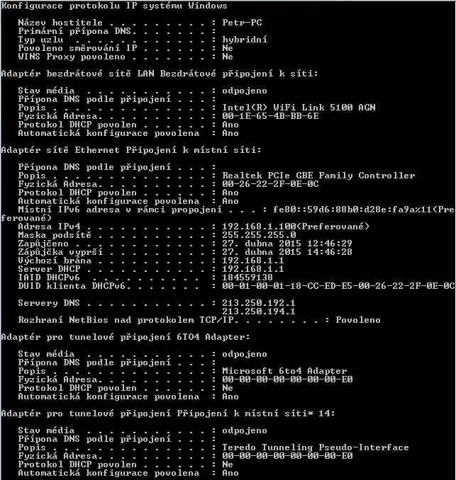 Omlouvám se, vložil jsem ipconfig/all před rebootem. Takto to vypadá když nastavím do WAN routeru ip od poskytovatele a v počítači v síťovém adaptéru nastavím ip automaticky. Ani když nastavím pouze DNS v síťovém adaptéru v počítači, tak to nefunguje. Stále je tu také možnost, že už wifi router nefunguje tak jak má, jenže jak to zjistit? Když Bliká a připojím se, pouze internet nefunguje.