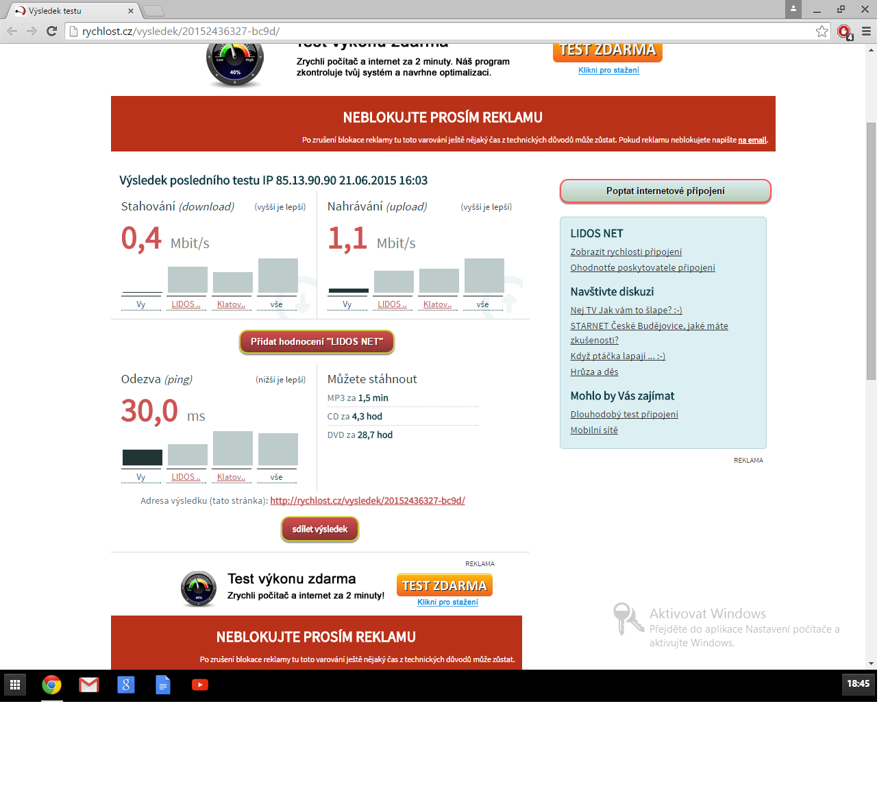 Věřte nebo ne s tímto žít je těžké: http://rychlost.cz/vysledek/20152436327-bc9d/ ale aspon něco i když film např. 736MB se mi stahuje 6 hodin a to se mi ani nedostáhne, asi po 2 minutách se stahování se vypne. Na youtube sotva zvládám kvalitu 360p se sekáním, někdy to nepustim ani na 144p.