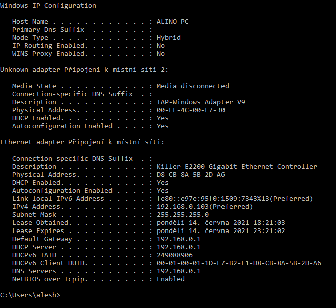 Udelej vypis IPCONFIG /ALL z prikazove radky.