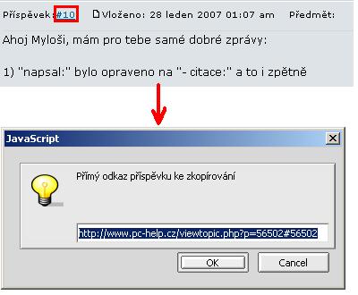 TZN. pokud se budete potřebovat odkázat na nějaký příspěvek ve svém novém příspěvku, stačí do něj vložit odkaz ze zobrazeného okna. Více viz přiložený screenshot níže. (tato úprava byla převzata ze skvělé stránky http://www.phpbbhacks.com)