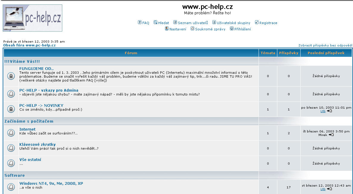 Přesto však stále zůstáváme místem pro umisťování PC dotazů všeho druhu. S otevřenou náručí vítáme každého, kdo řeší nějaký svůj PC problém. Nicméně se stejně otevřenou náručí vítáme i řadu rádců, kteří svojí nekonečnou snahou pomoci ostatním jsou pro nás nedocenitelnými partnery. Častokrát se lidi udivují, když jim vyprávím, na jakém principu naše fórum pracuje. Jen nevěřícně kroutí hlavou a přemýšlí nad tím, jak je to vůbec možné, že v dnešní době něco takového vůbec existuje. Že se někdo snaží bezzištně pomoci druhým, aniž by z toho, kromě dobrého pocitu a ranků ve fóru, něco dalšího měl..... Ale zpět k tomu vývoji - pojďme se teď projít časem....od roku 2003 až po současnost.2003