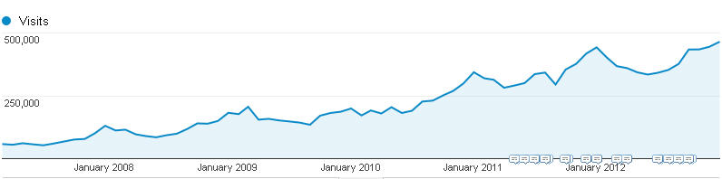 ....a jsme v roce 2013. Pojďme se ještě podívat, jak se fóru za celou tu dobu vedlo co se týče návštěvnosti - resp. pouze za období r2007 - dnes (dříve jsme GoogleAnalytics účet neměli). Jak je vidět, jdeme stále "do kopce" a jsme za to moc rádi