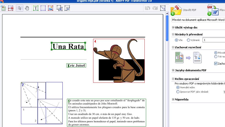 V příloze máš screen programu. V levém okně vidíš zpracování pdf dokumentu. Druhy objektů program rozděluje podle barev :