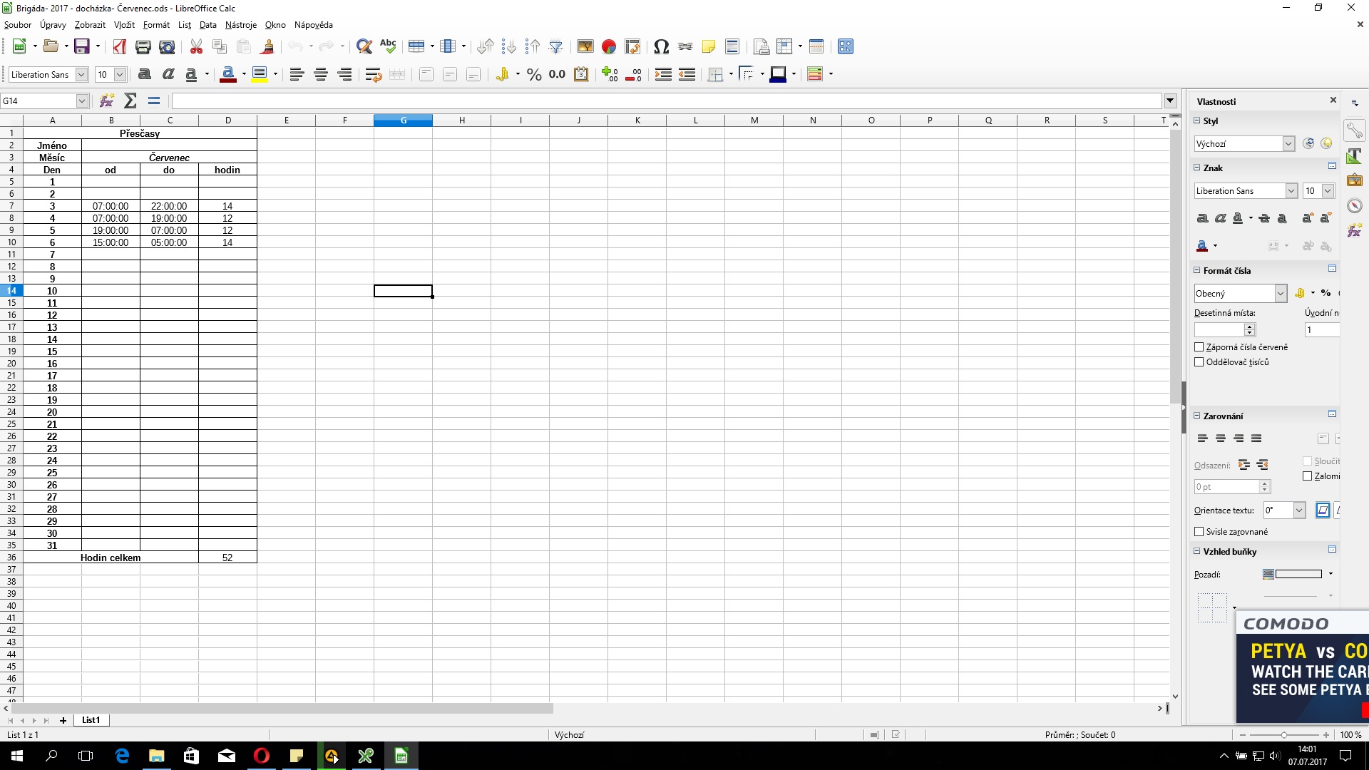 LibreOffice Calc - součet odpracovaných hodin