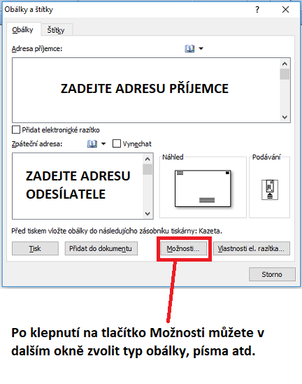 Nějak jsem pozapomněl, že mám v NTB nainstalovaný MS Office Word 2007. Nenapadlo mne se tam podívat, jestli je tam možné tisknout obálky. U huráá. Povedlo se mi vytisknout obálku. A protože mám radost a chci se o ni podělit s ostatními, tak přikládám 5 nascreenovaných obrázků, jakým postupem jsem to udělal. Snad z toho budou mít užitek i ostatní, kteří řeší stejný problém.