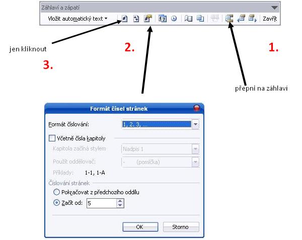 2. Klikni na ikonu ( na obrázku krok č. 2 ) a v tabulce "Formát čísel stránek" nastav "Začít od" - 5