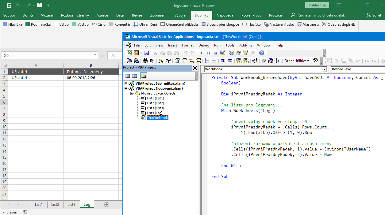 Logování lze zajistit i např. záznamem do textového souboru, zcela mimo tento sešit.