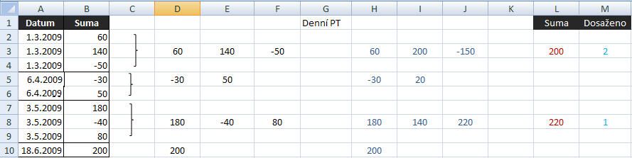 Jde mi o to, aby se mi sčítali hodnoty za den (B2 - B4, 60+140-50= 60...200 ... -150 ) a z modře vyznačených hodnot (viz. modré na obrázku ) by se zobrazovalo do tabulky L1 - M ? , maximální suma, která byla dostažena a kolikrát se tato suma vyskytla.