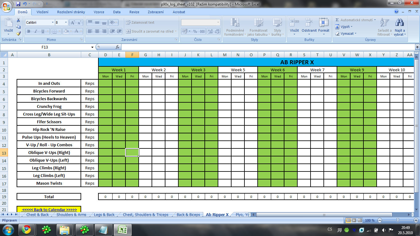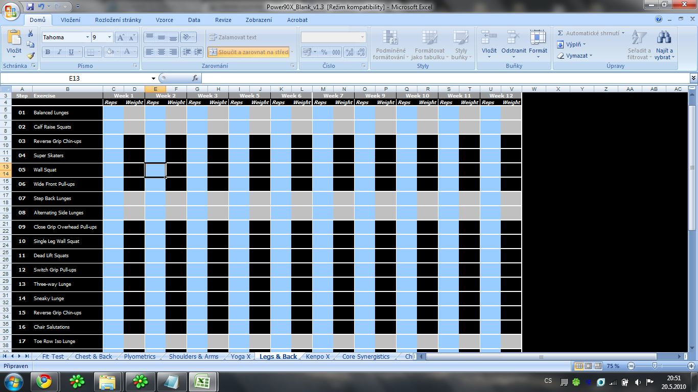 dobry den,mam ted nove takovy cvicebni program na posilovani (p90x) , obsahuje to videa a tabulky,navody atd, ...jsou tam u toho tabulky v excelu do kterych mam doplnovat hodnoty o kolik sem se zlepsil,pocet serii atd....,proste hafo informaci,tech tabulek je tam hodne(viz dole) a je to v AJ ,chtel bych si udelat cas a upravit ty tabulky do cestiny,pro prehlednost,ale nevim jak na to a jestli to vubec jde,kdyz mi nejdou oznacit ty zadane hodnoty ale jde jenom doplnovat.