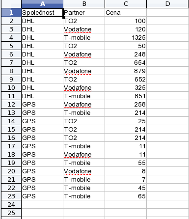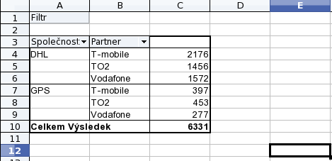 Cílem je vytvořit kontingenční tabulku, která bude počítat četnost kolikrát se vyskytuje společnost DHL a GPS, tedy u vodafonu 7x, u T-mobilu 8x a u TO2 7x. Problém je, že když ve filtru konting. tabulky vyfiltruji např. aby zůstaly společnosti TO2 a Vodafone, řádky s T-mobilem zmizí a mě se sníží počet společností DHL i GPS a já potřebuji abych v jednom sloupci měl celkový počet Společností (ve všech řádcích i těch nevyfiltrovaných) a v druhém vyfiltrovaný počet a udělat procentuální rozdíl mezi nimi.