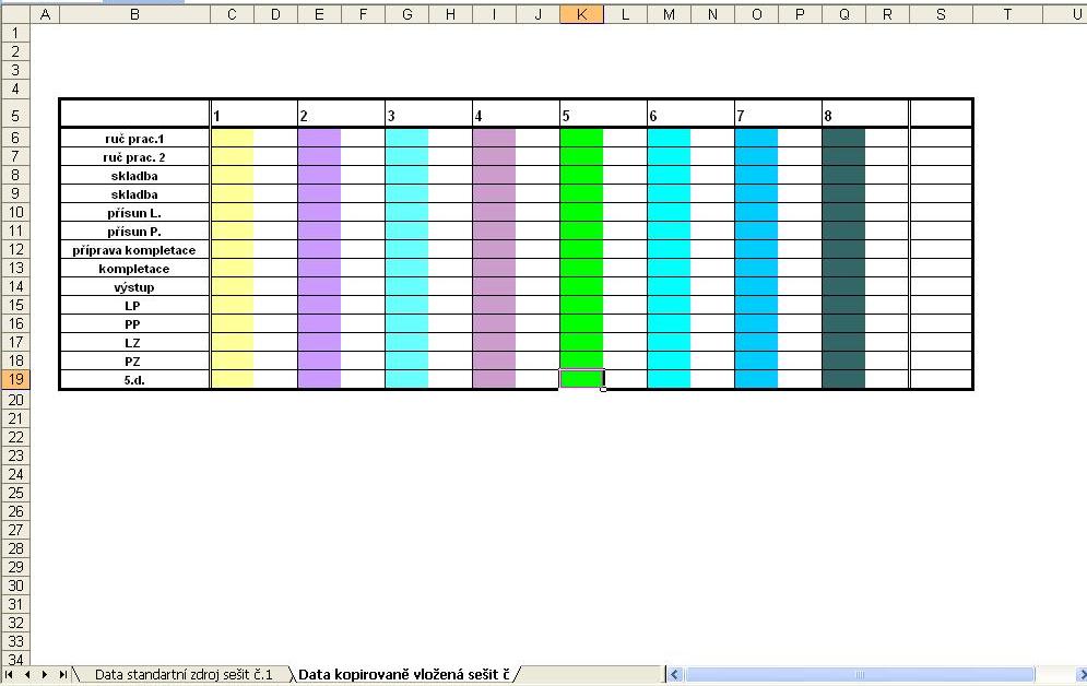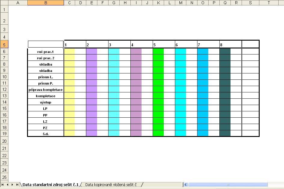 A tady stejná tabulka ale v jiném sešitu než předchozí ,z které se data budou pomocí maker kopírovat sem a to podle barev. Totožná barva k té samé barvě v tomto sešitu a do stejných buněk. Samozřejmě sešity jsou 2 ks a jde o to ze sešitu č.1 třeba zmáčknutím tlačítka data exportovat do tabulky druhé (této),která muže být buď zavřená a nebo otevřená.A nebo to bude transportovat data samo,nevím co je možné vytvořit v excelu.