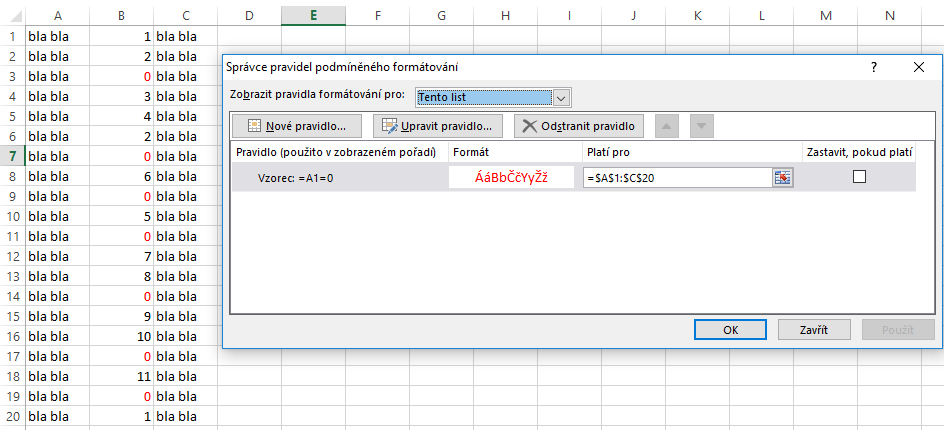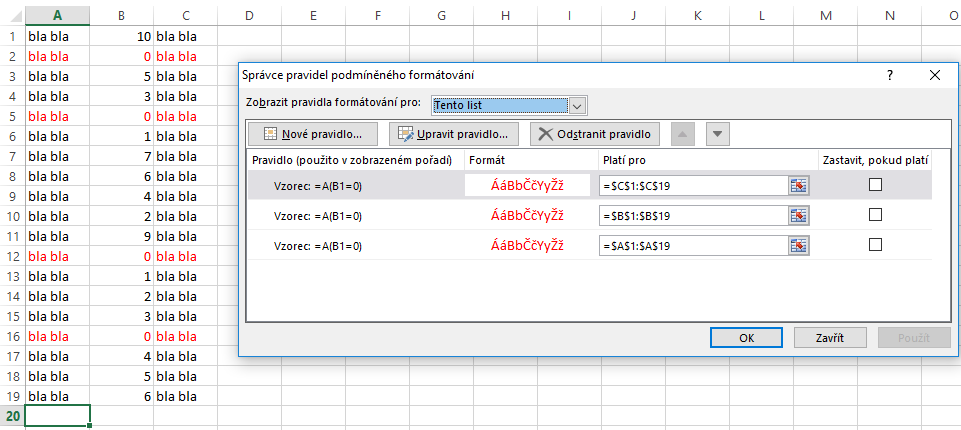 Takže, udělal jsem to snad podle poslední rady, označil A1:C20 a vložil vzorec do podmíněného formátování: =A1=0