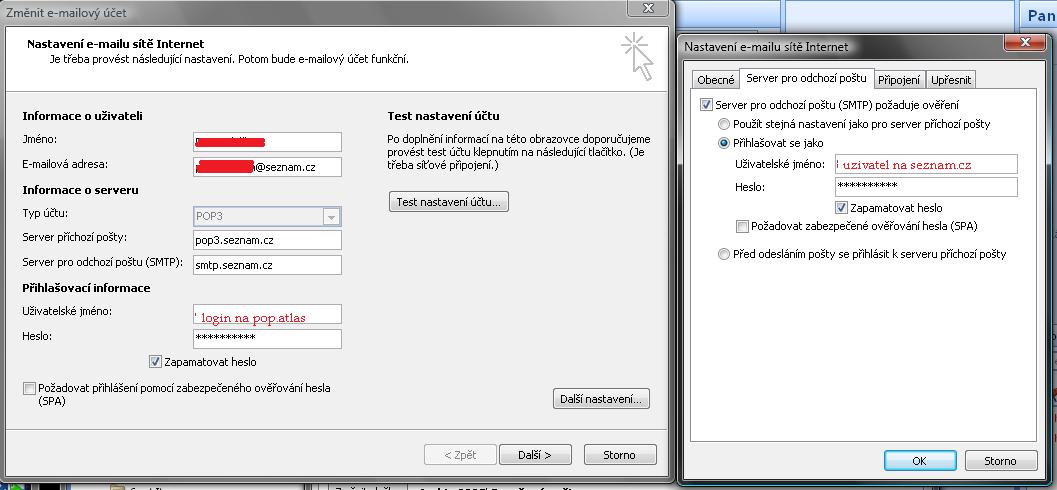 a napis sem co mas u polozek "server prichozi posty" a "server odchozi posty"