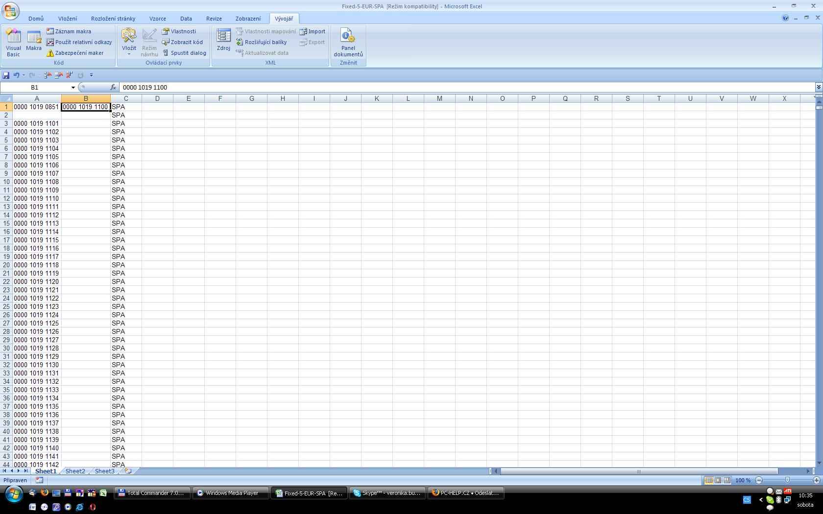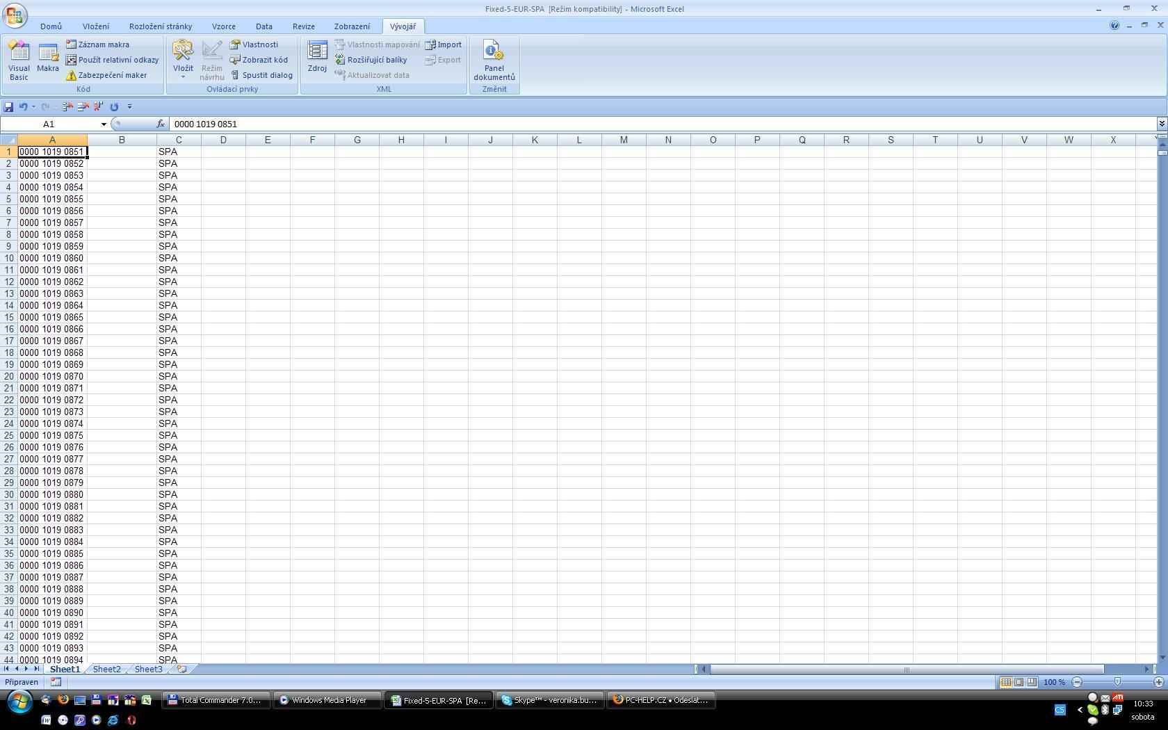 (tato tiskárna je velmi vyspělý stroj, zvládá potisknout až 33 tisíc karet za hodinu včetně vlastní kontroly kvality tisku a správného natištění dat), běžně na ní vyrábíme zakázky o půl milionu karet. Ale o toto nejde, dostáváme data v Excelu, NAPŘÍKLAD pro sortu BSH, která obsahuje 60.000 řádků ve 5ti sloupcích s daty. Já tyto tabulky ručně upravuji pro vytváření etiket ve Wordu, pro krabičky kam dáváme potištěné karty po 250-ti kusech, kdy potřebuji z tabulky použít pouze data pro první a 250tou kartu (první a poslední z krabičky) a to tak, že potřebuji zachovat v datech vždy první kartu, pak smazat 248 řádků, 250 řádek zachovat, a ten přesunout do druhého sloupce k první kartě, pak smazat vzniklý prázdný řádek a celé opět opakovat. Nevím jestli to popisuji nějak pochopitelně, proto přikládám obrázky z této činnosti, kterou velmi potřebuji zautomatizovat - zabírá to ruční prací neskuteně mnoho času.