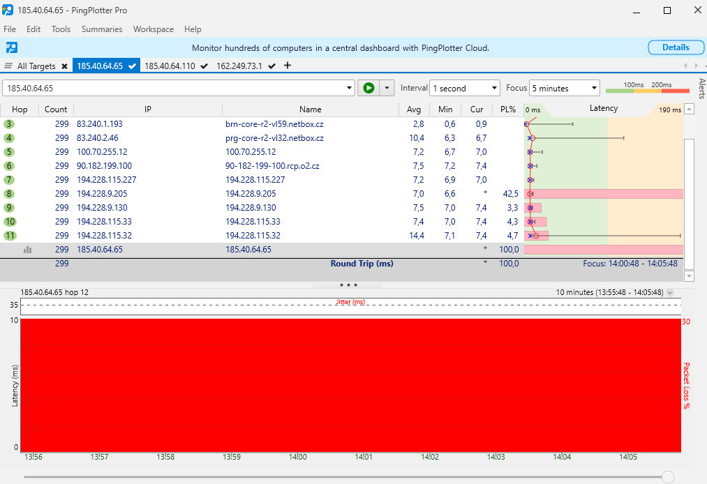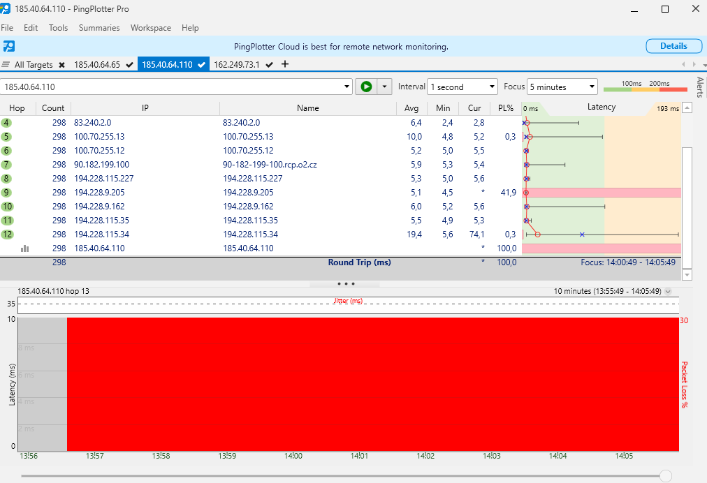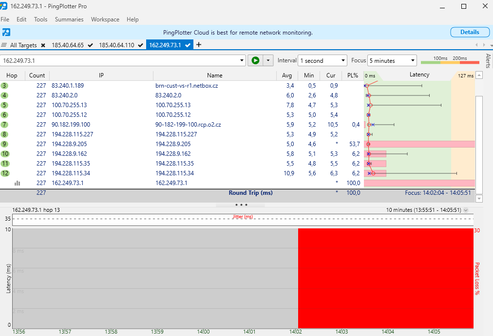 Vidis tu radku, kde je ten velky packet loss? Tak tam je problem.